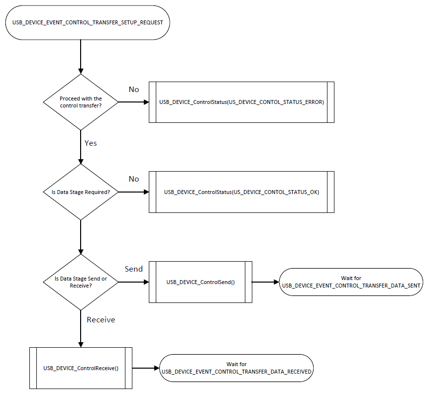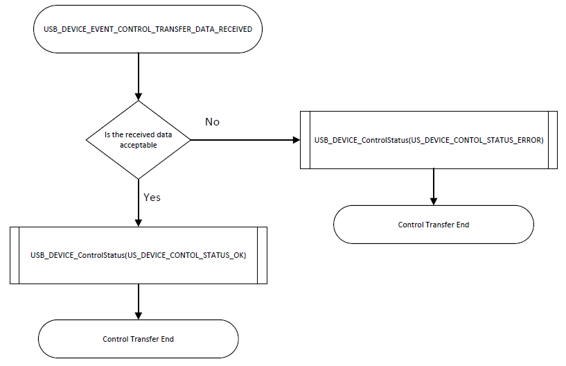 In a case where data is to be received from the host, the device layer generates USB_DEVICE_EVENT_CONTROL_TRANSFER_DATA_RECEIVED event when the data stage has completed. The application can analyze the received data and can then either choose to acknowledge or stall the control transfer by the calling the USB_DEVICE_ControlStatus function with the USB_DEVICE_CONTROL_STATUS_ERROR flag. This is shown in the following flow chart.