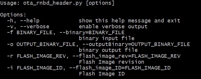 - Run ota_rnbd_header.py script. Below is the syntax to show help menu for