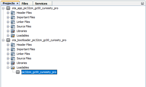 - As the external memory may not have any valid binary required by OTA bootloader for the first time. Adding the ota_app as loadable allows MPLAB X to create a unified hex file and program both these applications in their respective memory locations based on their linker script configurations.