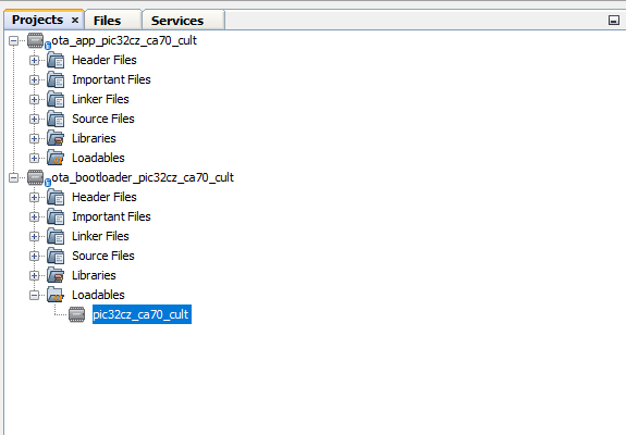 - As the external memory may not have any valid binary required by OTA bootloader for the first time. Adding the ota_app as loadable allows MPLAB X to create a unified hex file and program both these applications in their respective memory locations based on their linker script configurations.