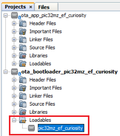- As the Dual Bank Flash memory may not have any valid binary required by OTA bootloader for the first time. Adding the ota_app as loadable allows MPLAB X to create a unified hex file and program both these applications in their respective memory locations based on their linker script configurations.