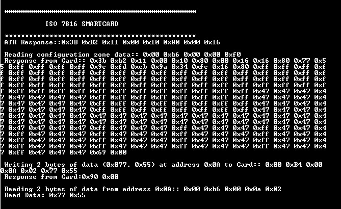 This example demonstrates data read and write to AT88SC1616C smartcard over USART using ISO7816 mode of communication. The example starts with reading the configuration zone data, writing 2 bytes of data and reading back. In the process, the example demonstrates various ISO7816 APIs.