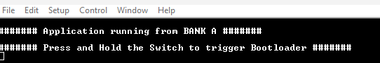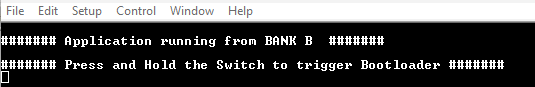 Press and hold the Switch SW0 to trigger Bootloader from test application to program firmware in other bank and the user should see below output.
