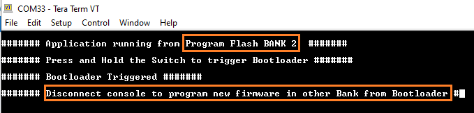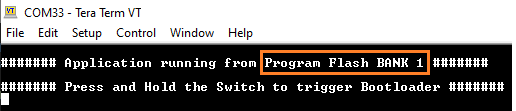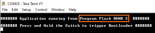 Press and hold the Switch SW1 to trigger Bootloader from test application to program firmware in other bank and the user should see below output.