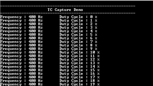 This example shows how to use the TC module in Capture mode to measure duty cycle and frequency of an external input.