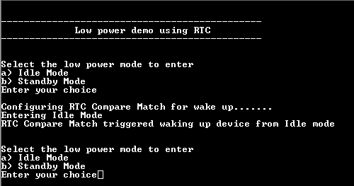 This example demonstrates entering the Low Power modes and exiting it using the RTC.
