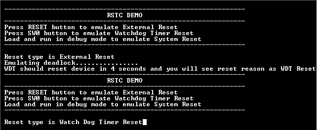 - WDT will reset the device in four seconds and the demonstration should restart.