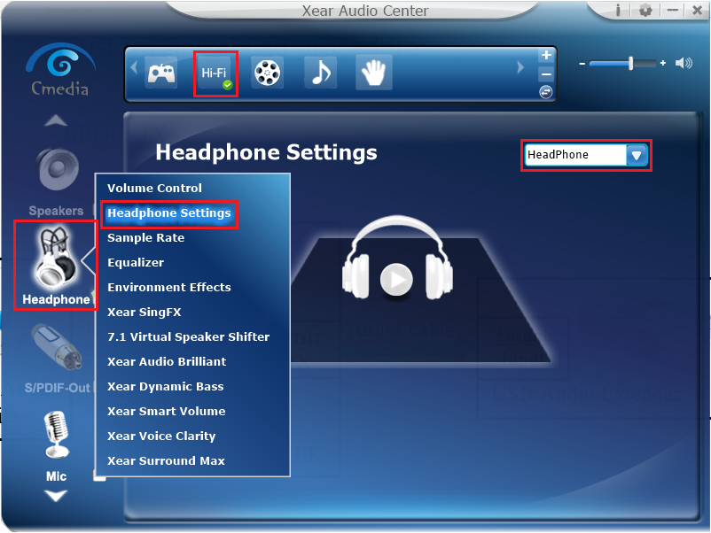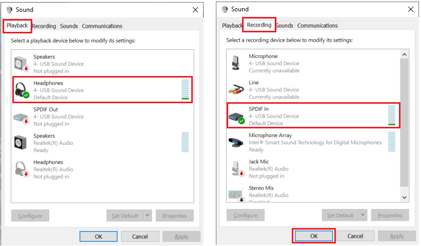 Playback tab, ensure that Headphones is selected. In the Recording tab,