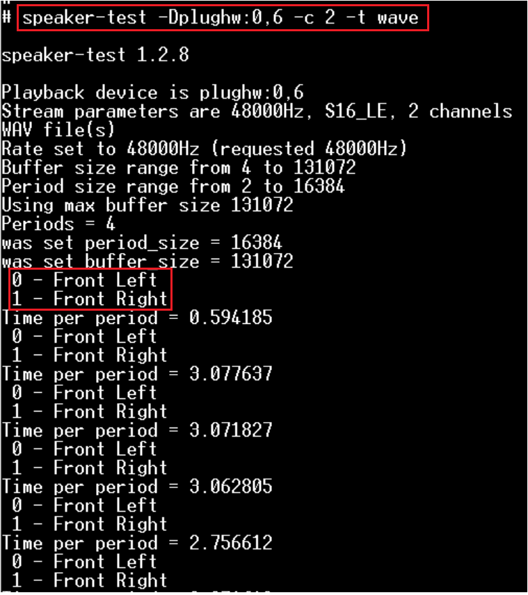$ speaker-test -Dplughw:0,6 -c 2 -t waveListen to the audio data, making sure it can be heard on the Front left and Front Right audio channels.