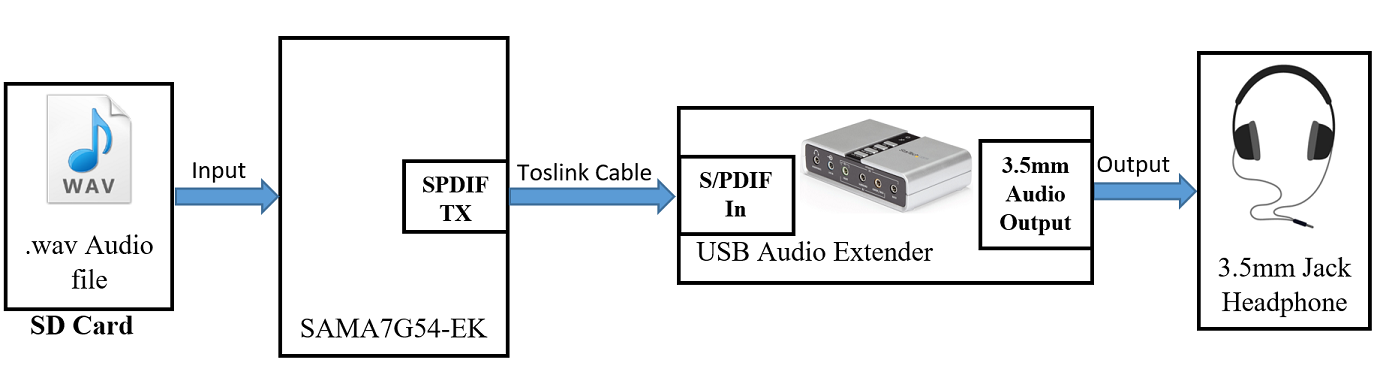 In this test, the audio file (.wav file) is transmitted through the SPDIF TX peripheral on the board. It is received as an SPDIF input on the USB audio extender and can be heard through headphones connected to the USB audio extender.