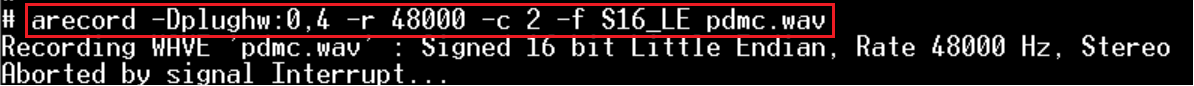 $ arecord -Dplughw:0,4 -r 48000 -c 2 -f S16_LE pdmc.wav