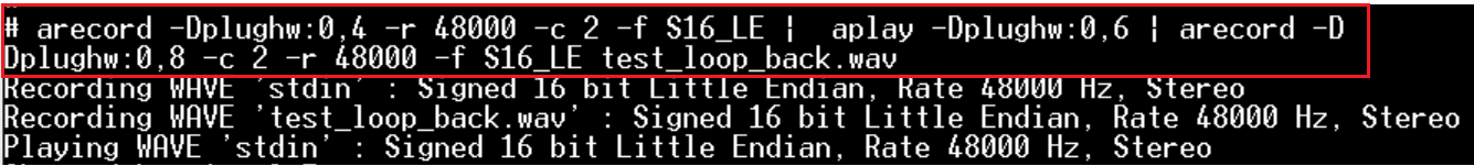 $ arecord -Dplughw:0,4 -r 48000 -c 2 -f S16_LE | aplay -Dplughw:0,6 | arecord -Dplughw:0,8 -c 2 -r 48000 -f S16_LE test_loop_back.wav